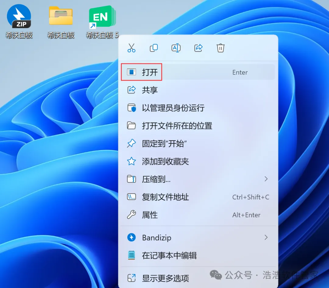 8、回到桌面,右键桌面上的【希沃白板软件图标】,点击【打开】