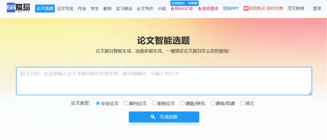 掌握先机,方能领跑学术,用68爱写AI等专业ai生成专著教材工具,配合人工审校,必能实现效率与质量双赢。将繁琐内容堆叠交给AI论文工具,将核心思想创新留给自己。