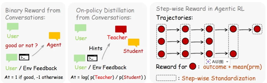 第一种是评估性信号。用户满意就给正分,不满意就给负分;用户重复提问往往意味着不满,测试通过则意味着成功。这些信号被一个名为"过程奖励模型"(Process Reward Model, PRM)的裁判模块捕捉。