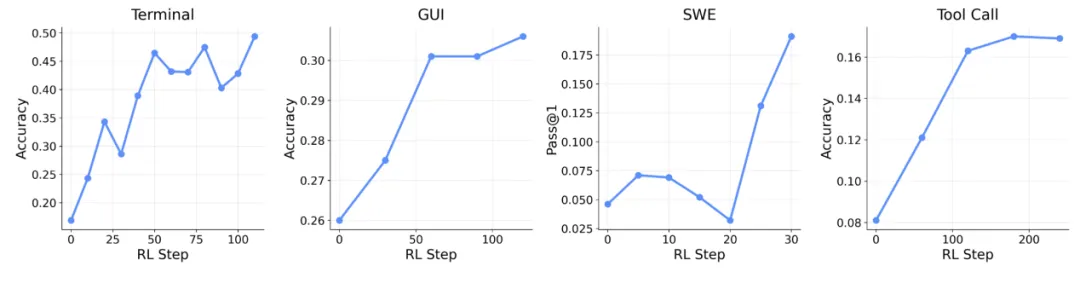 据杨灵介绍,这套训练框架的一个重要发现是:来自不同 Agent 场景(终端、GUI、代码、工具调用)的交互数据可以放在同一个框架中联合训练,并且模型在各个维度上都呈现出整体性的上升趋势。"这意味着统一的 Agent 强化学习训练是可行的,"杨灵说,"如果这条路能走通,对于构建真正通用的 AI 智能体会是一个非常关键的基础。