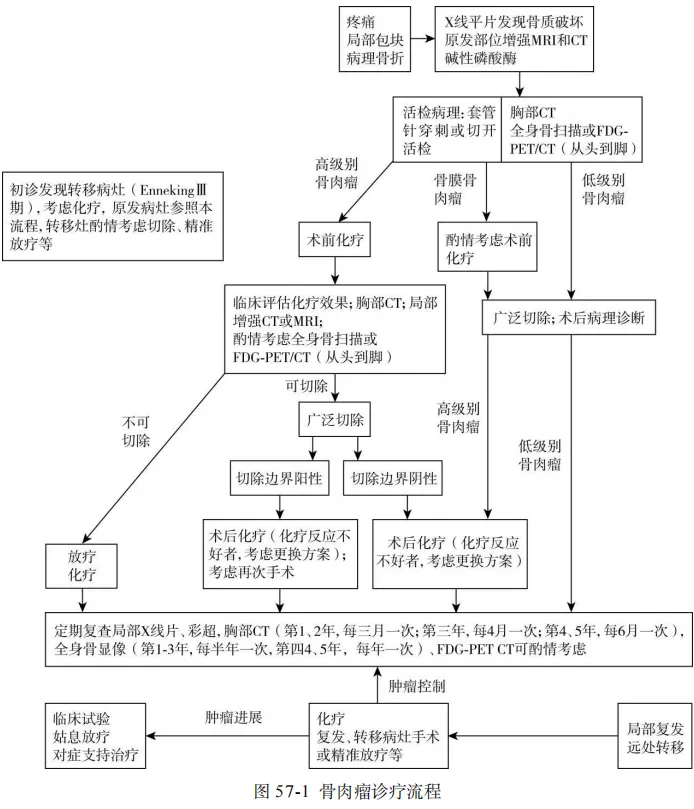 高级别骨肉瘤确诊后,即应进行新辅助化疗(常用药物包括阿霉素、顺铂、大剂量甲氨蝶呤、异环磷酰胺)。化疗后需要根据肿瘤分期及术前化疗的效果决定手术方案。建议在肿瘤反应区外、间室内正常组织广泛切除肿瘤。大多数患者可以保肢,在四肢部位,人工肿瘤假体常被用于重建骨关节缺损。
