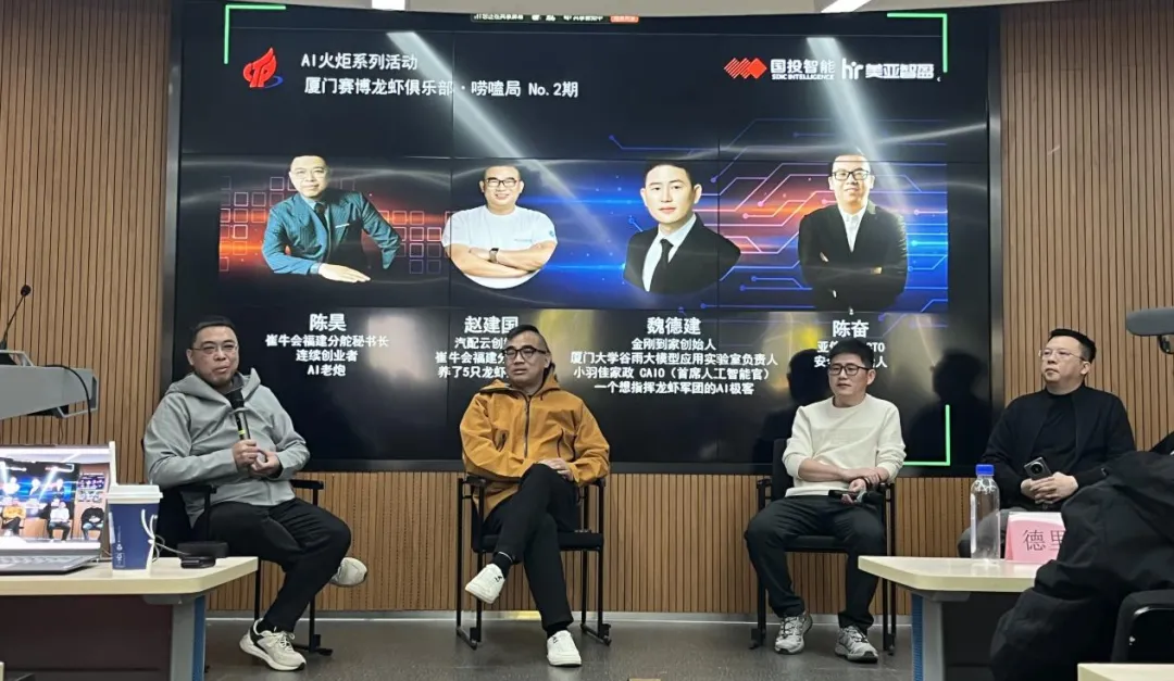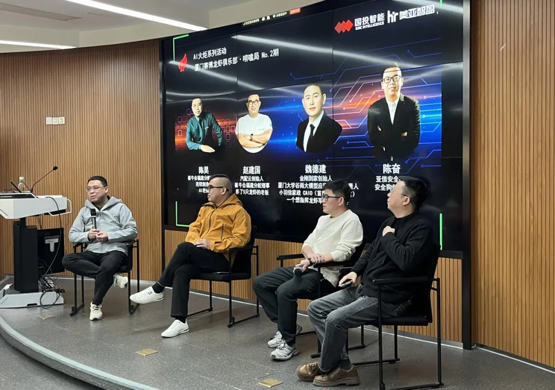 在崔牛会老炮“虾"聊环节,崔牛会四位成员——崔牛会福建分舵秘书长、AI老炮陈昊,汽配云创始人、崔牛会福建分舵理事赵建国,金刚到家创始人魏德建,亚信安全CTO、安全狗创始人陈奋围绕OpenClaw 落地实践、安全管控与企业 AI 开放策略展开激烈讨论。
