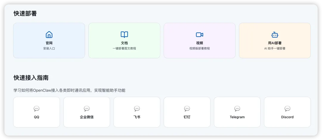 以及QQ、飞书、钉钉等IM应用的接入步骤,3步完成部署,即刻拥有专属AI助手。