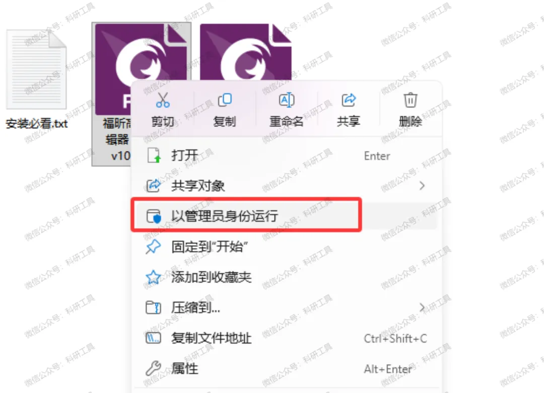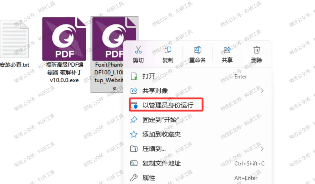 3. 🔑 找到安装程序(FoxitPhantomPDF100_L10N_Setup_Website),右键选择“以管理员身份运行”;
