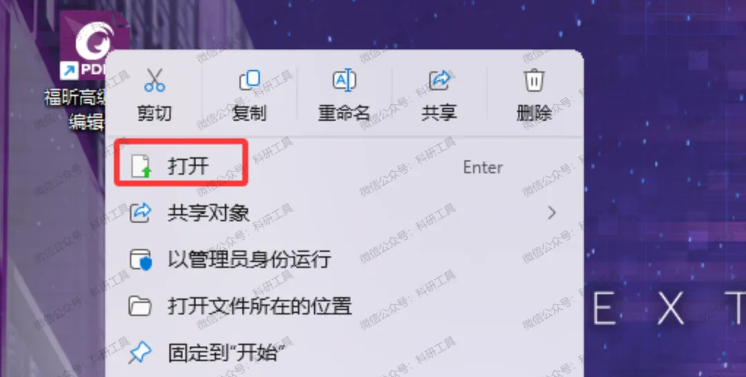 14. 🖥️ 回到电脑桌面,找到“福昕高级PDF编辑器”图标,鼠标右击选择“打开”;