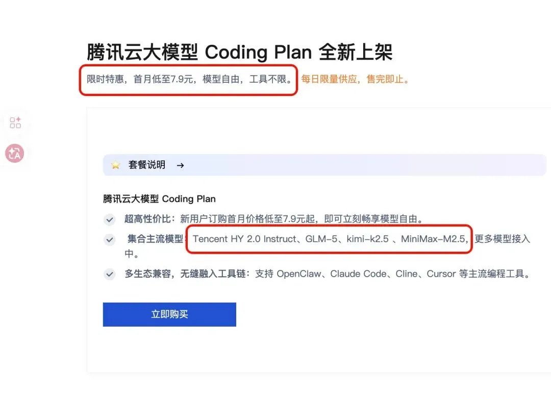 7.9元/月的coding plan来了 https://buy.cloud.tencent.com/hunyuan