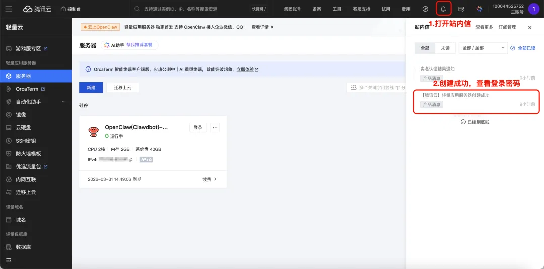 购买完成后,点开”站内信“查看的服务器用户名和密码。
