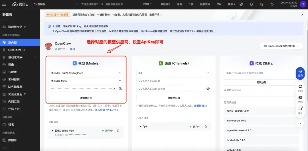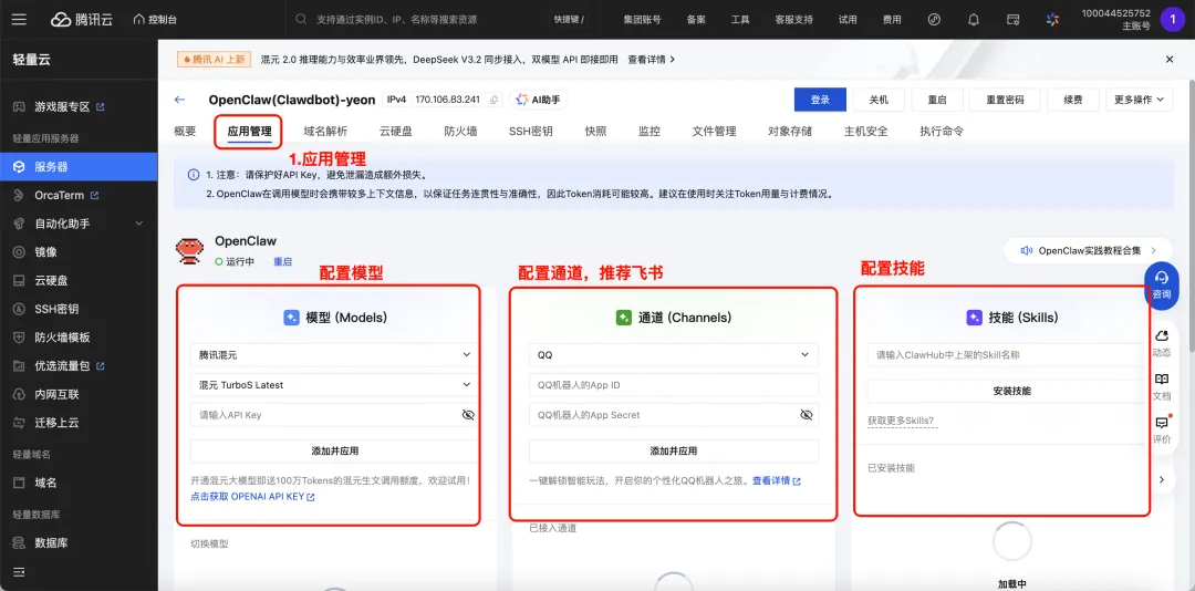 进入应用管理,可以配置 OpenClaw 的模型、通道和技能。