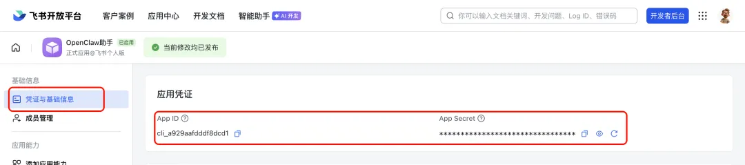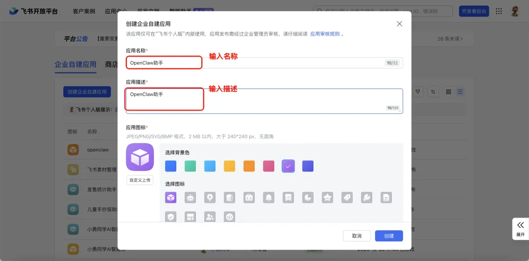 填写应用名称(如 “OpenClaw助手”)、应用描述,点击创建按钮。
