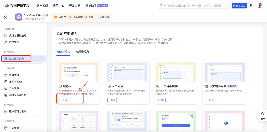 进入应用管理页面,左侧导航栏中找到添加应用能力,在列表中选择机器人,点击添加。