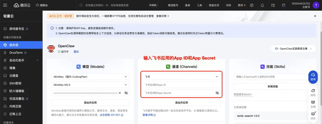 以腾讯云服务器为例,通道设置选择飞书,输入App ID和 App Secret,点击添加并应用。