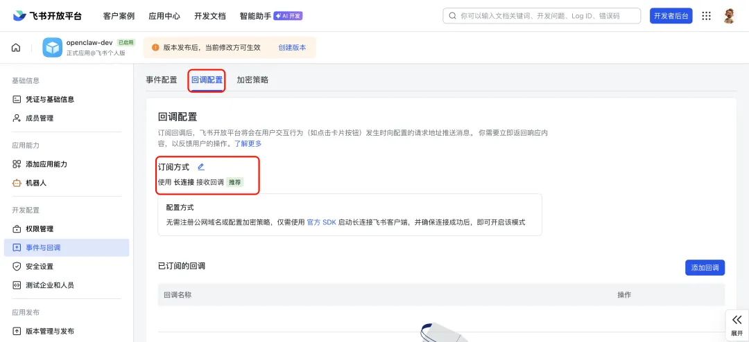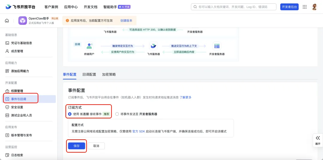在回调配置中,订阅方式选择 “使用长连接接收回调”,点击保存,无需填写其他地址,配置自动生效。