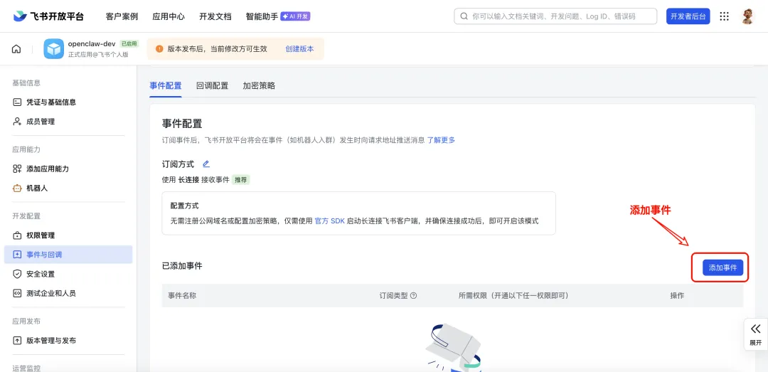 在飞书应用管理页,左侧导航栏找到 “事件与回调” ,在“事件配置”页签中选择 “长连接接收事件”,点击保存。