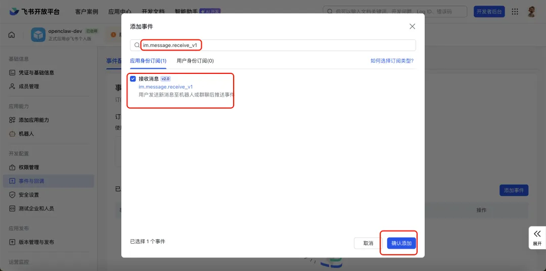 添加事件 im.message.receive_v1,表示"收到消息时通知我"。