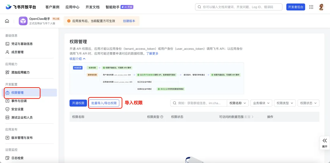 在飞书应用管理页,左侧导航栏找到权限管理。点击页面中的批量导入权限按钮,弹出权限导入窗口。