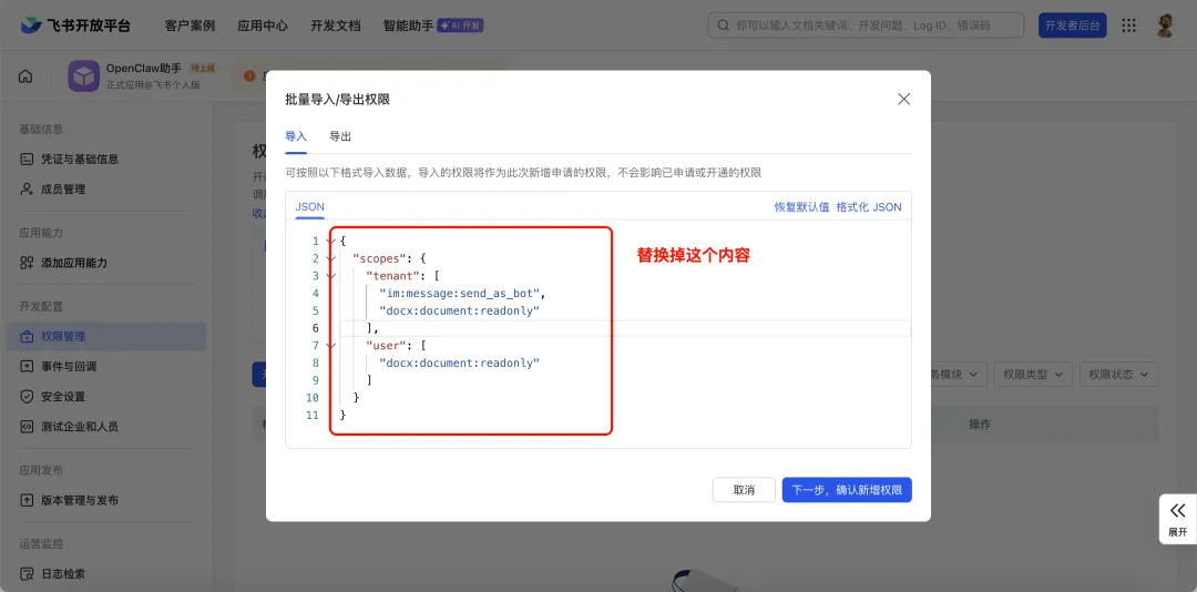 复制以下代码,替换前面弹窗中原有的JSON内容,点击下一步,确认新增权限,继续申请开通
