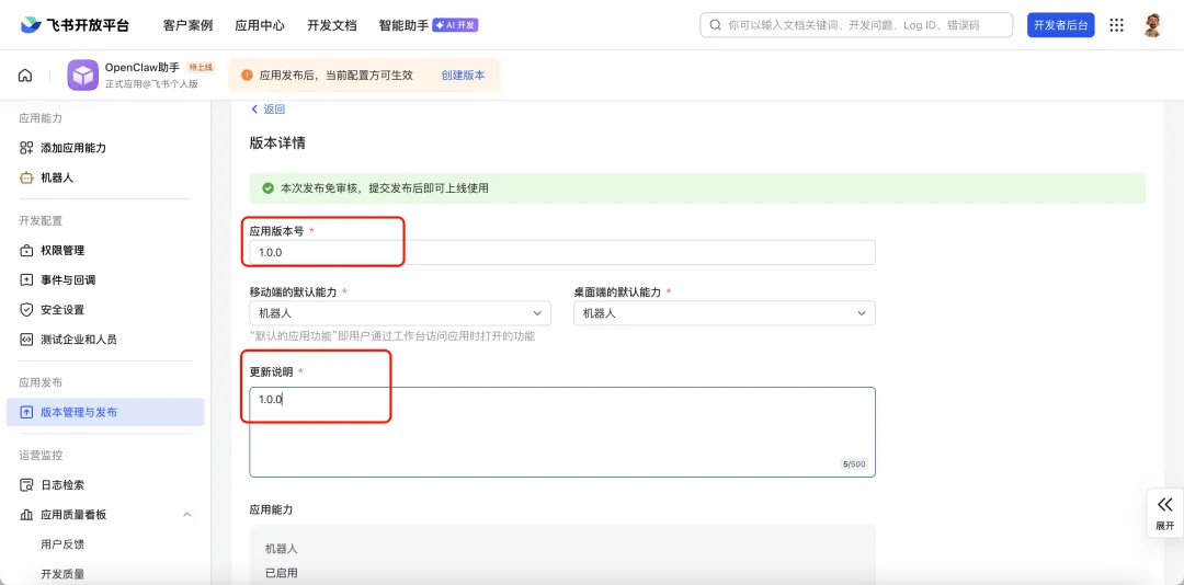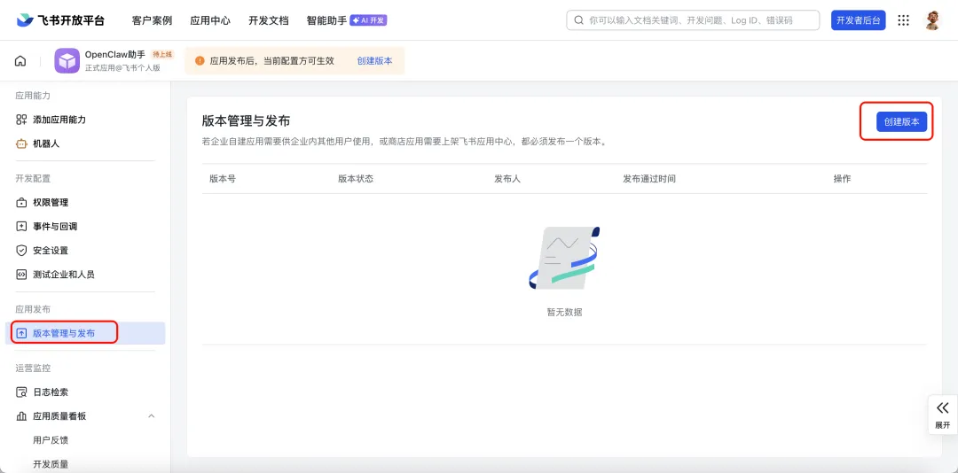 在飞书应用管理页,左侧导航栏找到 “版本管理与发布” ,点击进入页面。点击右上角的创建版本。
