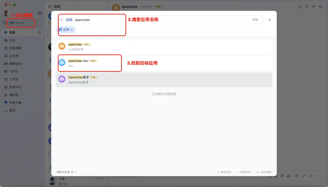 以电脑版飞书为例(手机端飞书的操作类似),点击搜索框,输入应用名称,点击对应的应用。