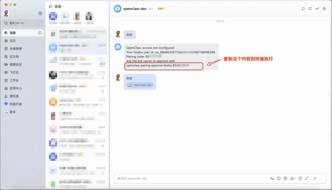 发送消息后,如果出现权限提示,按照提示复制最后一行到终端执行即可
