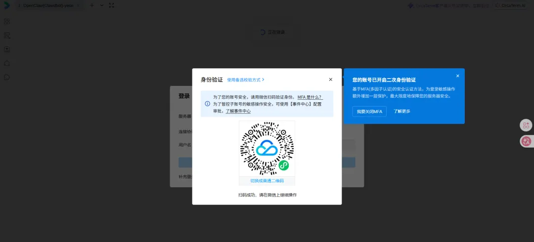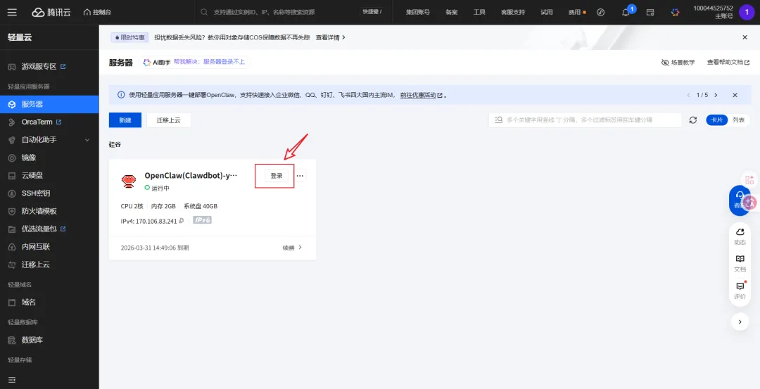 云服务器部署的话,按照下面的图片进入终端,扫码登录后执行命令即可