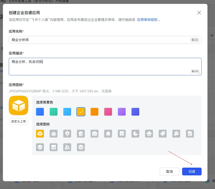 填写应用名称和描述,直接点击创建即可。
