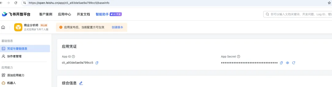 创建完成后,会自动生成 App ID 和 App Secret,这两个凭证后面配置 OpenClaw 时会用到,先记下来。