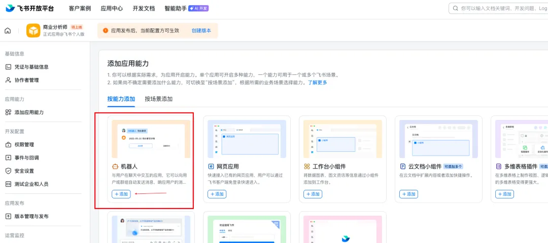 在应用详情页左侧菜单找到「机器人」,点击添加。