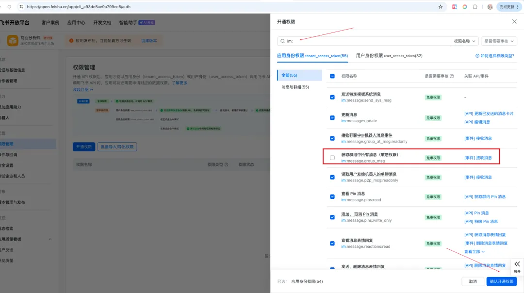 进入「权限管理」,找到 im: 相关权限,全部勾选。