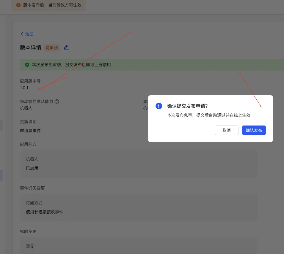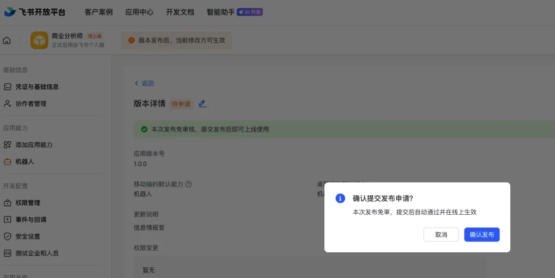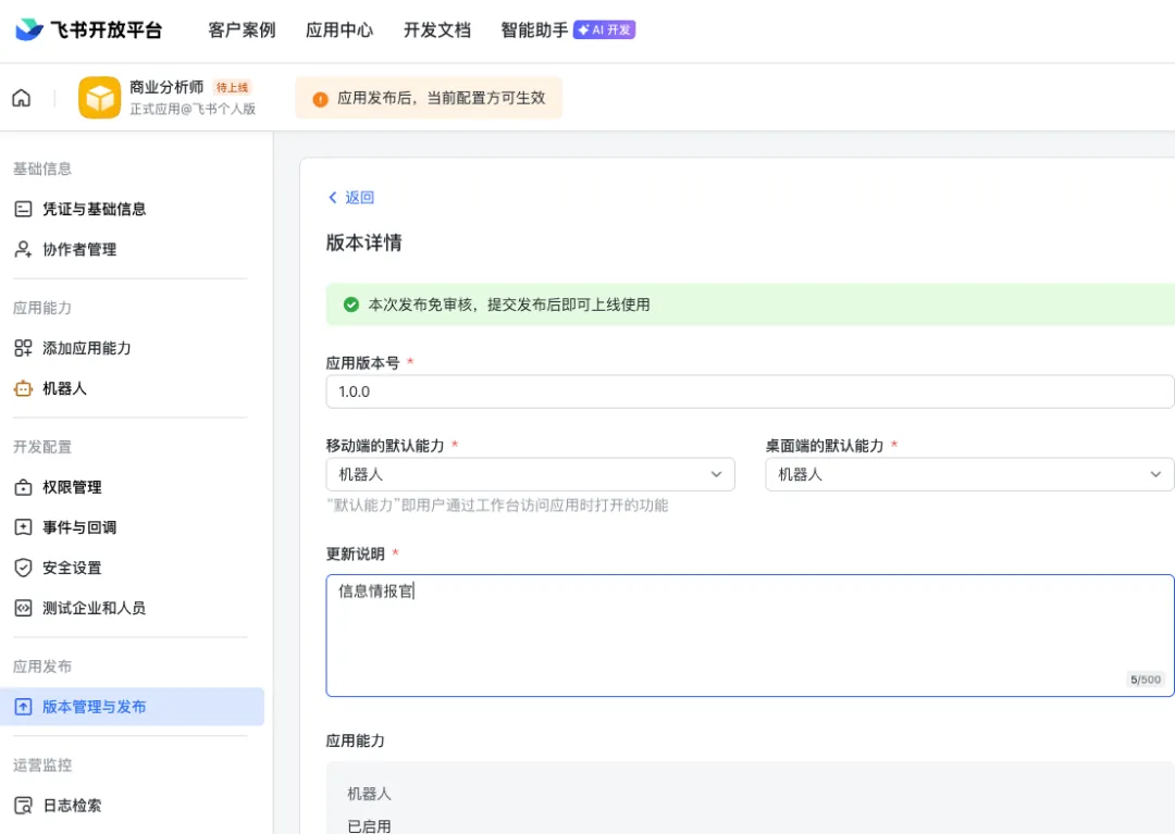发布新版本后,飞书的「开发者小助手」会收到通知消息。