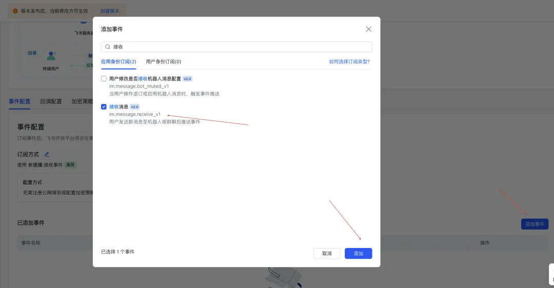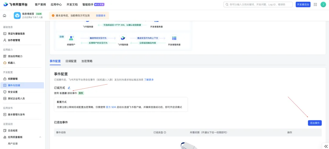 网关重启后,回到飞书开发者后台配置事件订阅。