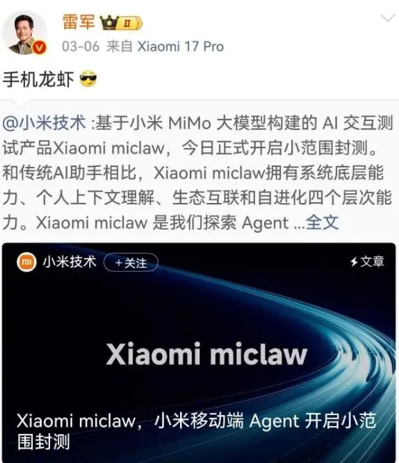 龙虾热潮进入移动端硬件。我们看到,手机大厂华为、小米、荣耀接连宣布布局手机OpenClaw应用。3月6日,小米雷军连发四篇微博,介绍说,基于小米MiMo大模型构建的AI交互测试产品 Xiaomi Miclaw开启小范围封测。