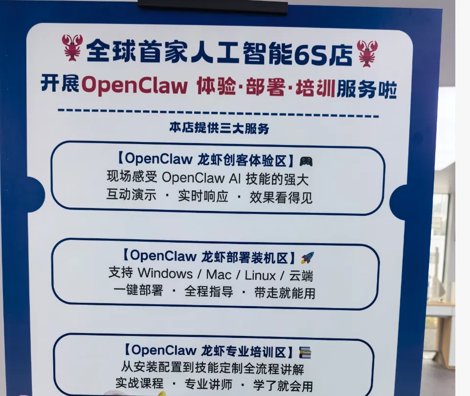 今年开年就看到了硬件行业接入“龙虾”的潮流,像智能终端、AI眼镜、智能家居、学习机,还有各种电子消费品,都在适配。在深圳龙岗区人工智能6S店,笔者也看到开展OpenClaw体验和部署活动。据6S店员工介绍,最近来申请安装OpenClaw的用户量不少,他们已经开始招募工程师志愿者了。