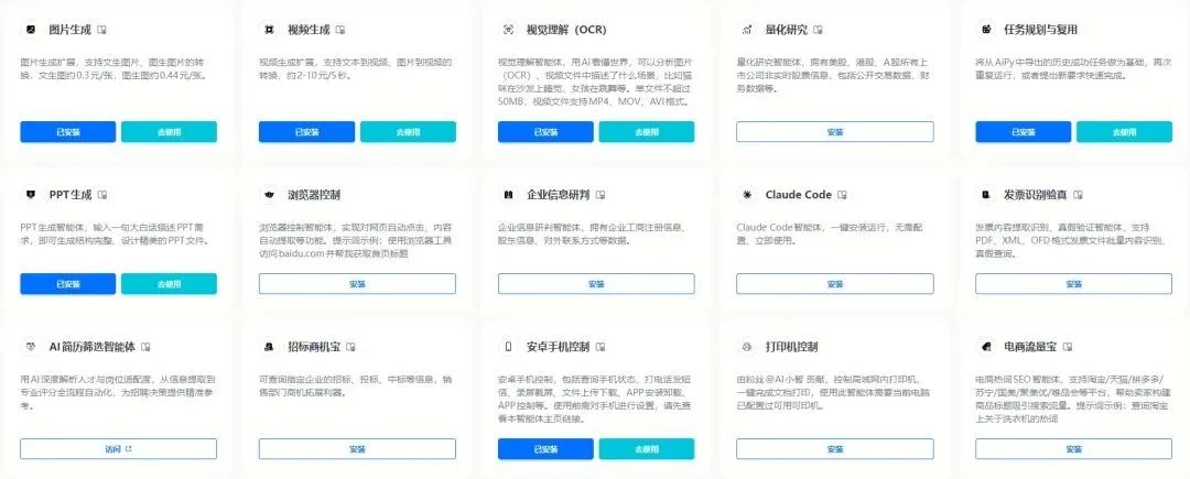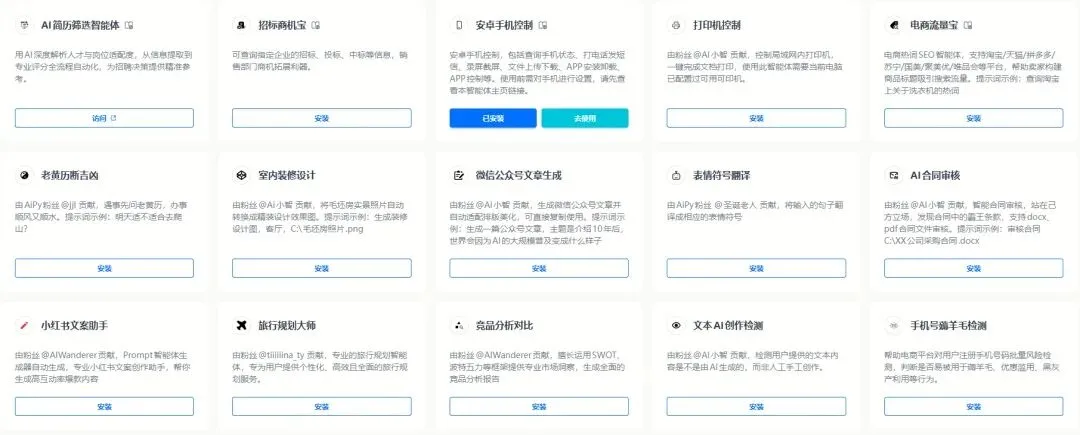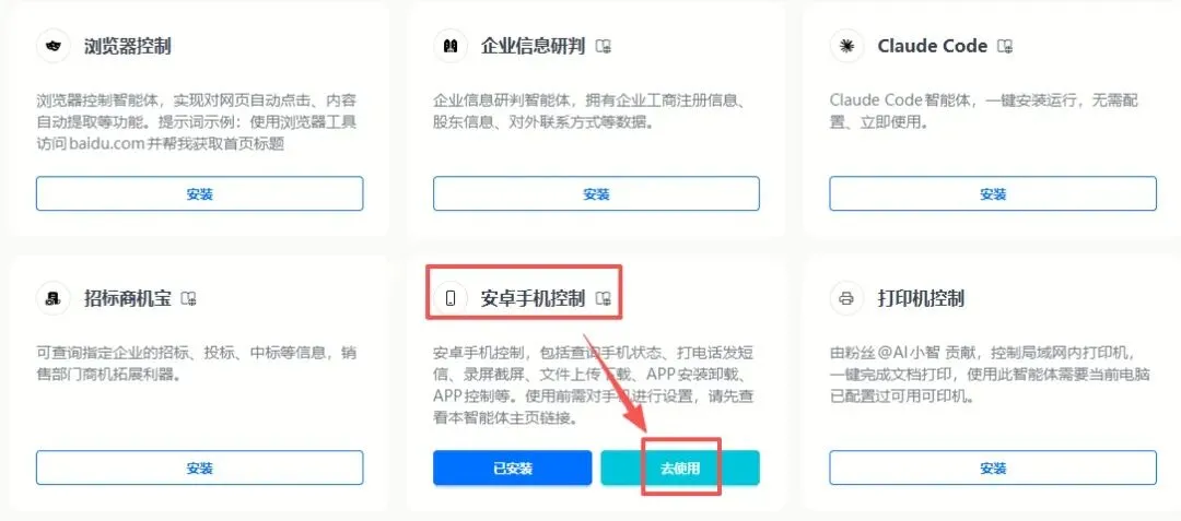 设置完成后,在AiPy的智能体集市里找到"安卓手机控制",安装并启用。