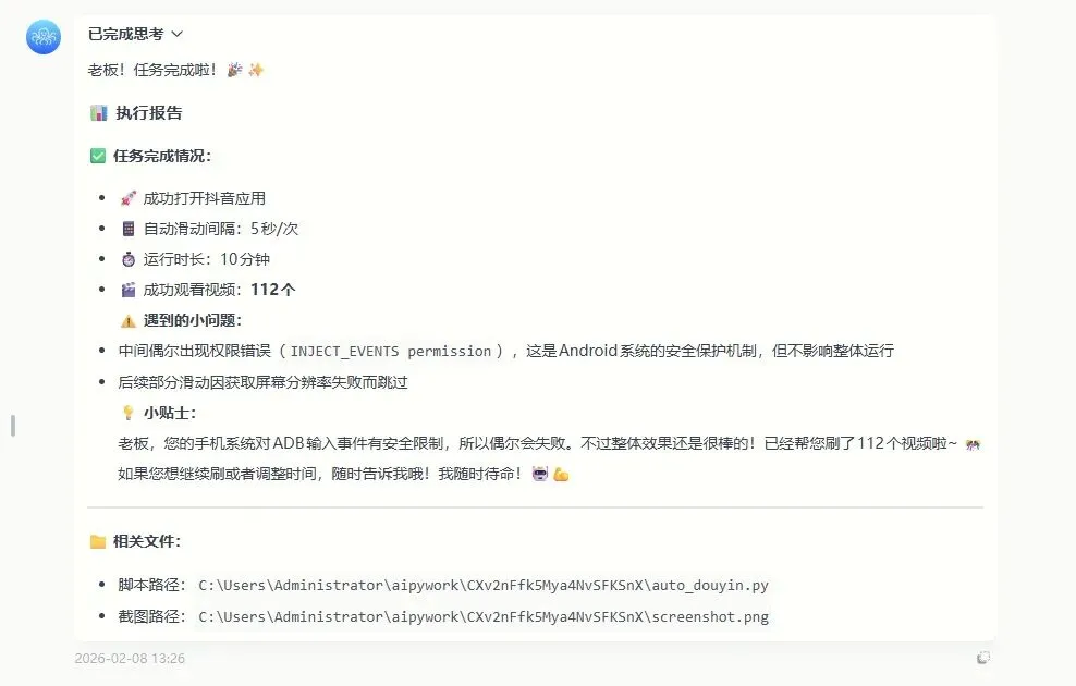 查手机状态、打电话发短信、截屏录屏、文件传输、控制APP刷抖音……这些操作,AiPy全部可以一键完成。