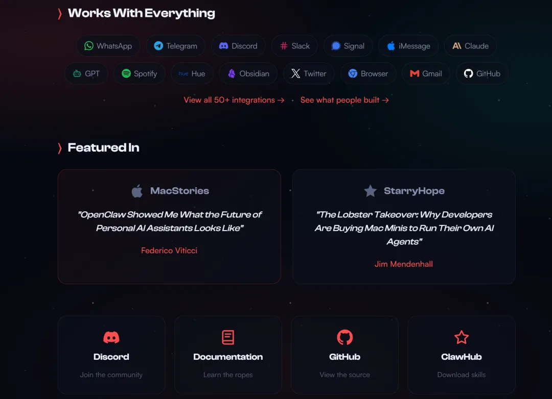 OpenClaw 的标语很直白:“真正能做事的 AI”。