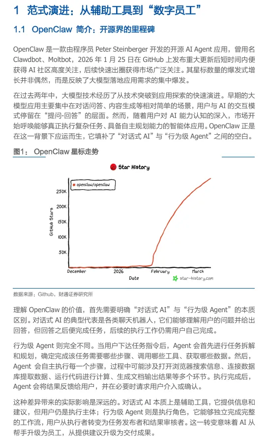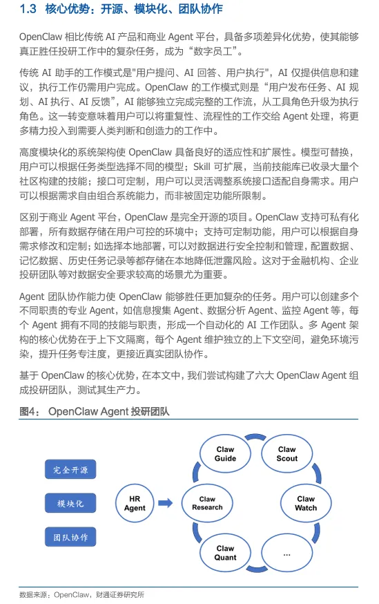 摘要:2026 年 OpenClaw 作为开源 AI Agent 工具,凭借模块化、多 Agent 协作优势成为智能投研利器,可构建六大专业投研 Agent 团队,覆盖市场复盘、持仓监控、量化回测、财报分析等全投研流程。支持虚拟机、云平台部署,适配数据安全需求,能将投研流程自动化,让投研人员聚焦核心决策,大幅提升投研效率,当前已在投研领域实现落地应用。