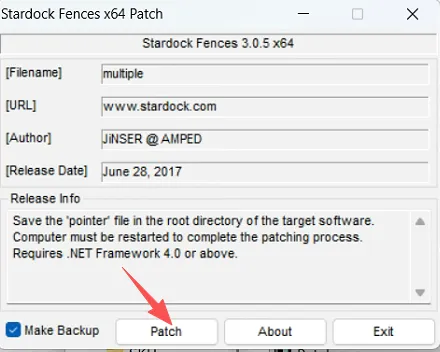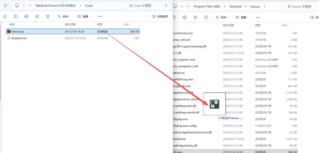 10.打开Crack文件夹后拖住复制Path程序到Fences所在的安装目录位置