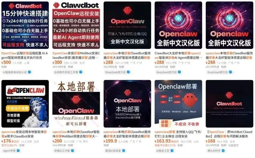 现在,各个平台上已经出现了大量提供OpenClaw上门及远程安装调试的服务。其中,远程安装定价300元,上门安装调试500元,高端定制服务更是1000元起步。