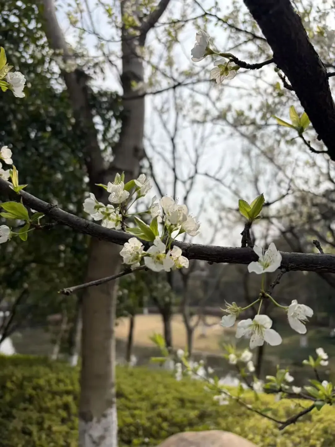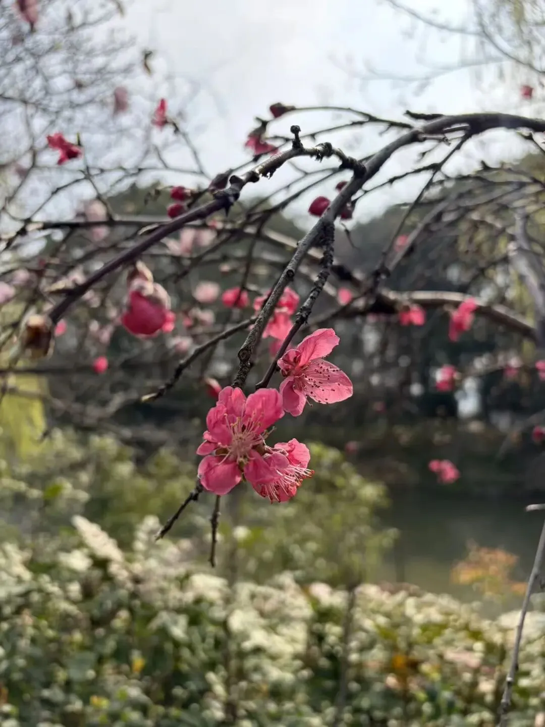 如果说桃花是热烈的粉,那李花就是温柔的白。千桃园里的李花已经悄悄开放,细碎的小白花攒成一团,缀在枝头,像落了一层春雪。清新素雅的模样,和旁边待放的桃花、盛放的美人梅相映成趣,是春日里最温柔的背景板。