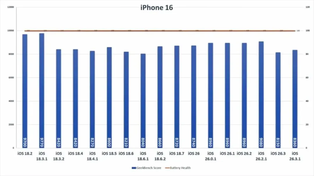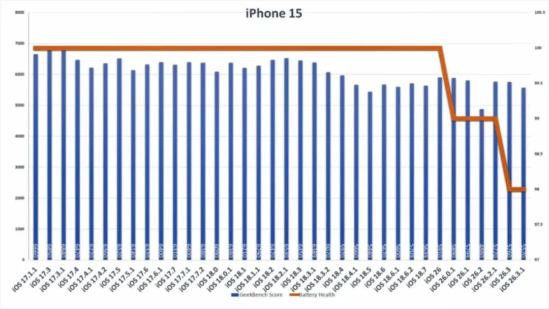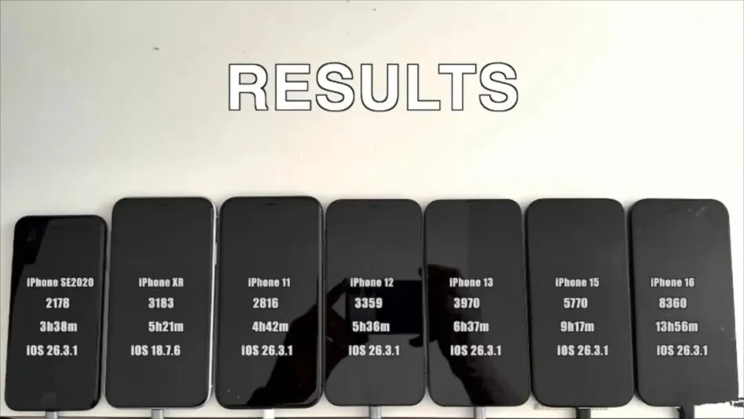 iOS26.3.1别乱更新,这3款iPhone能升级,其余3款再等等苹果每次升级新版本iOS,都会对在售的iPhone产生较大的影响。尤其是iPhone的电池续航能力表现,会因为iOS版本的不同,而出现增加或者减少。这次,给大家带来的是iOS26.3.1的电池续航测试。这次参与升级iOS26.3.1版本的iPhone,一共有6款。分别是iPhoneSE2020、iPhone11、iPhone12、iPhone13、iPhone15、iPhone16。第一个测试环节,将这6款iPhone进行电池电量耗尽测试。等待电池全部耗尽,6款iPhone全部自动关机之后,续航结果如下:iPhoneSE2020,耗时3小时38分钟,排名第六。iPhone11,耗时4小时42分钟,排名第五。iPhone12,耗时5小时36分钟,排名第四。iPhone13,耗时6小时37分钟,排名第三。iPhone15,耗时9小时17分钟,排名第二。iPhone16,耗时13小时56分钟,排名第一。第二个测试环节,运行GeekBench软件对电池进行跑分测试。测试的跑分结果越高,说明电池的续航能力表现越强。iPhoneSE2020,电池得分为2178分。iPhone11,电池得分为2816分。iPhone12,电池得分为3359分。iPhone13,电池得分为3970分。iPhone15,电池得分为5570分。iPhone16,电池得分为8360分。iOS26.3版本iPhoneSE2020,电池得分为2071分。iOS26.3.1版本iPhoneSE2020,电池得分为2178分。电池得分上升,所以iPhoneSE2020建议升级iOS26.3.1。iOS26.3版本 iPhone12,电池得分为3366分。iOS26.3.1版本iPhone12,电池得分为3359分。电池得分下降,所以iPhone12不建议升级iOS26.3.1。iOS26.3版本iPhone13,电池得分为3910分。iOS26.3.1版本iPhone13,电池得分为3970分。电池得分上升,iPhone13建议升级iOS26.3.1版本。iOS26.3版本的iPhone15,电池得分为5760分。iOS26.3.1版本的iPhone15,电池得分为5570分。电池得分下降,所以iPhone15不建议升级iOS26.3.1版本。iOS26.3版本iPhone16,电池得分为8150分。iOS26.3.1版本iPhone16,电池得分为8360分。电池得分上升,所以iPhone16建议升级iOS26.3.1。iOS26.3的iPhone11,电池得分为3286分。iOS26.3.1的iPhone11,电池得分为2816分。电池得分下降,所以iPhone11不建议升级iOS26.3.1版本。最终的测试结果为,iPhone11、iPhone15、iPhone12,不建议升级iOS26.3.1。iPhoneSE2020、iPhone13、iPhone16,建议升级iOS26.3.1版本。