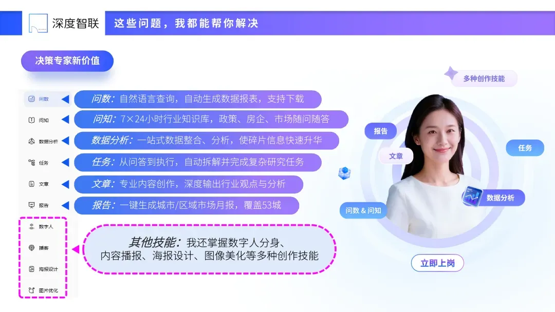 想象一下:你对OpenClaw说,“帮我写一份上海市2025年年度市场分析报告”,它立刻调用深度智联的决策专家模块,拉取土拍、新房、二手房最新数据,一小时内生成结构清晰、数据翔实的简报,直接推送到你的飞书对话框。