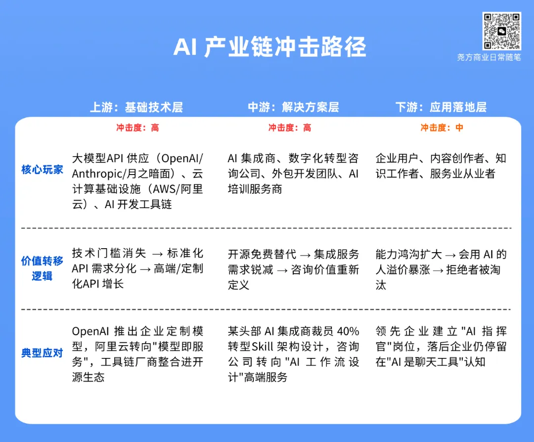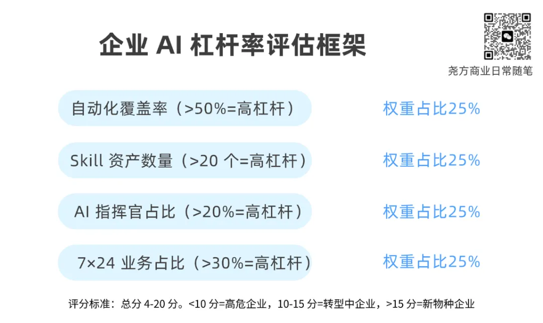 关键洞察:企业之间的差距,不再是"资金差距"或"资源差距",而是"AI 杠杆率差距"。一家善用 AI 的小公司,可以击败一家拒绝 AI 的大公司。