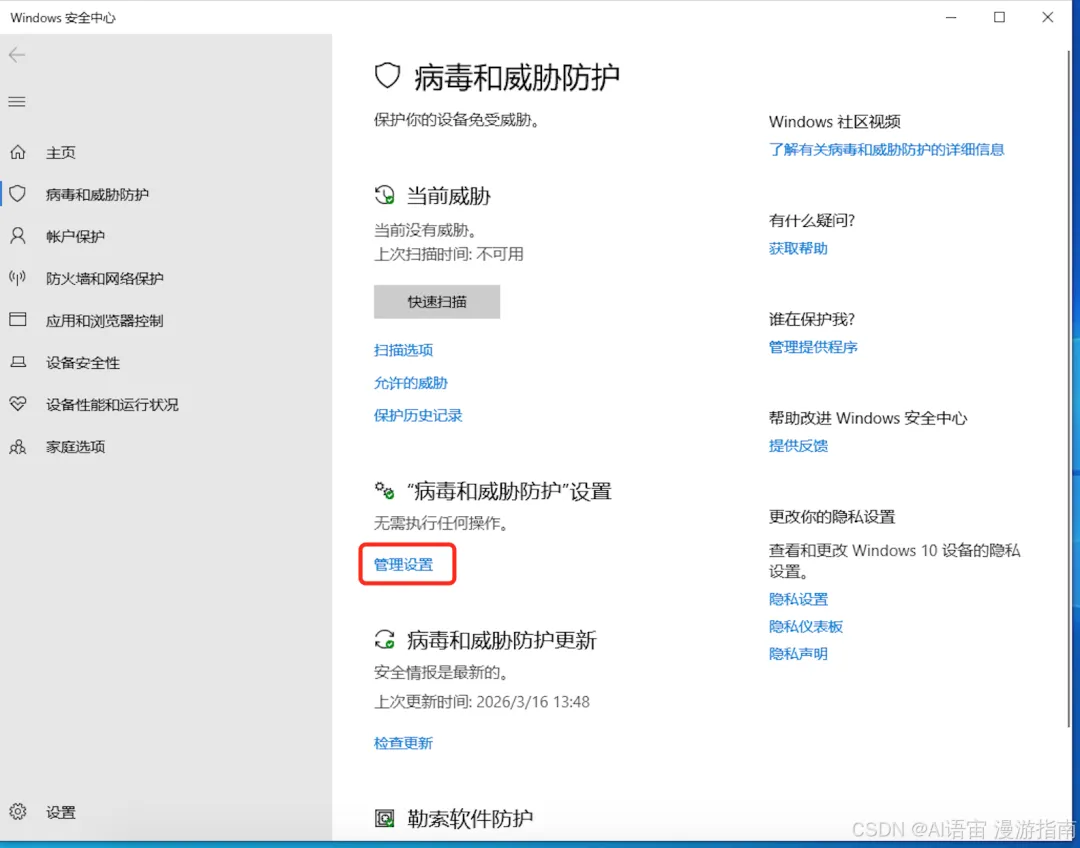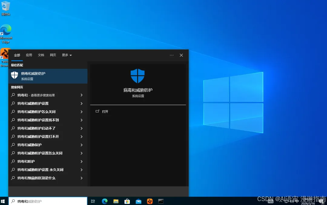 在搜索栏输入 "病毒和威胁防护",