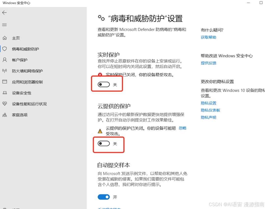 把 "实时保护" 关掉。⚠️注意:不用关这个窗口,装完 OpenClaw 再回来打开防护。