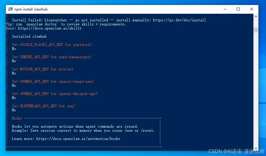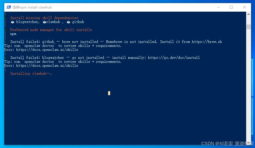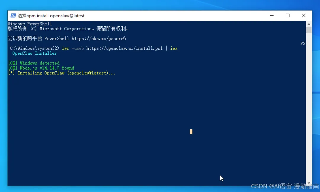 iwr -useb https://openclaw.ai/install.ps1 | iex这时候要等一会儿,因为要从国外网站下载,比较慢,耐心点。