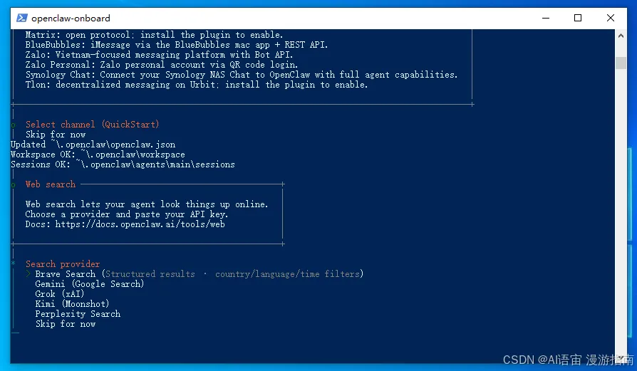• 搜索引擎:选 Brave Search,API Key 没有就回车跳过