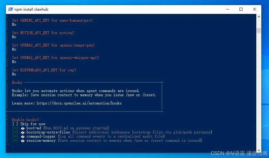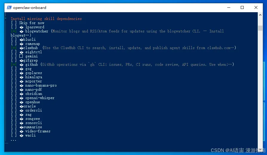 • 要不要装技能:选 Yes,用空格选 blogwatcher、clawhub、github,然后回车
