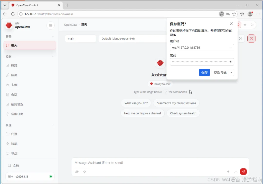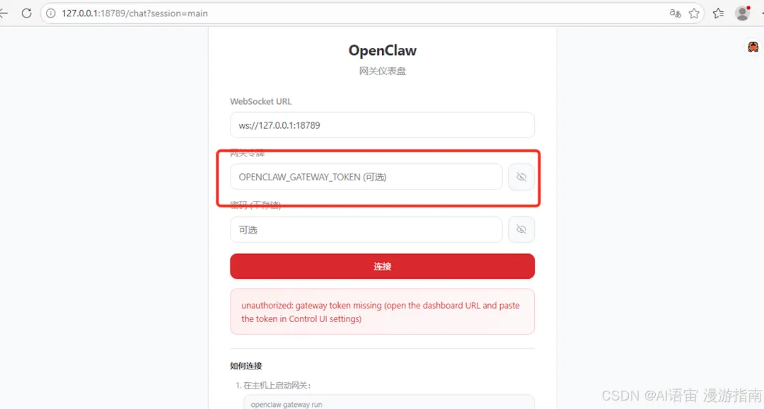 装完后浏览器访问 http://127.0.0.1:18789。在 PowerShell 窗口找个叫 Token 的东西(一串乱码),复制到网页的 "令牌" 那栏。密码可以留空,点"连接"。