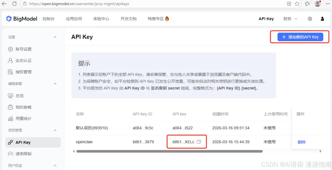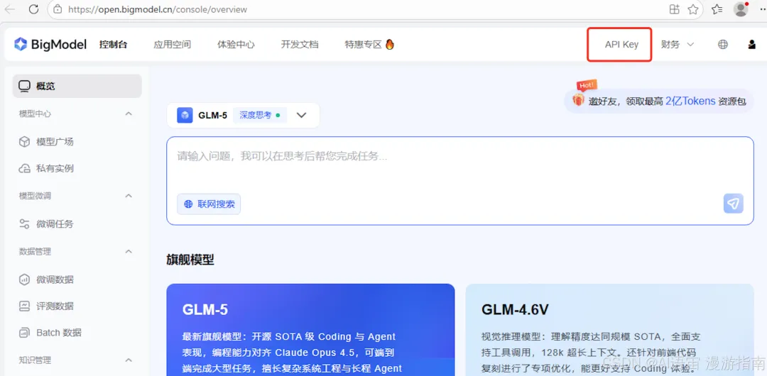 打开 https://open.bigmodel.cn,注册个账号,然后点"控制台" → "API Key" → "新增 API Key",复制下来,后面要用。