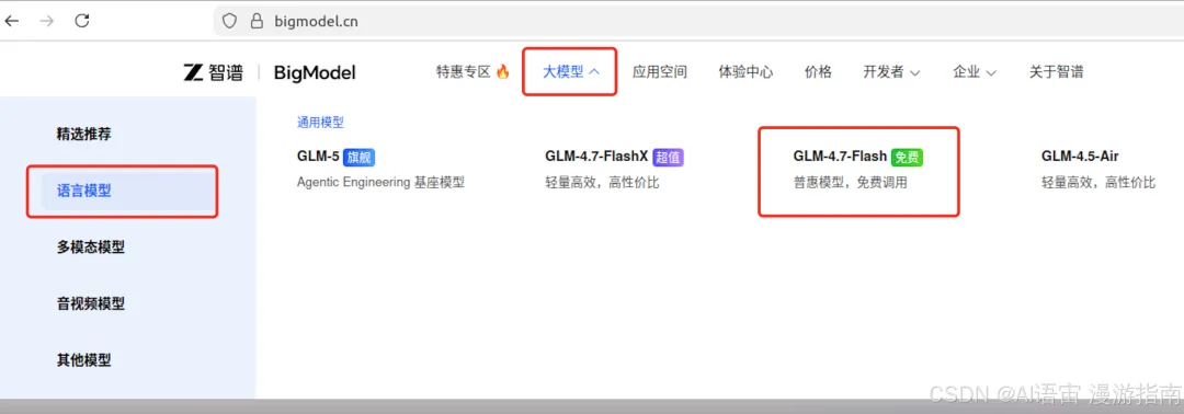 回到首页,点"大模型" → "语言模型",找到 GLM-4.7-Flash。